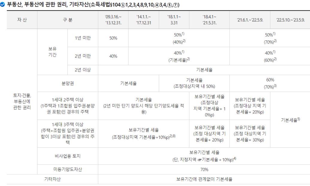 앞서 언급했듯이 양도세의 경우 취득시기와 , 보유기간, 주택수, 소재지에 다라 양도세율이 달라지기 때문에 양도세 계산이 복잡할 수 있습니다.