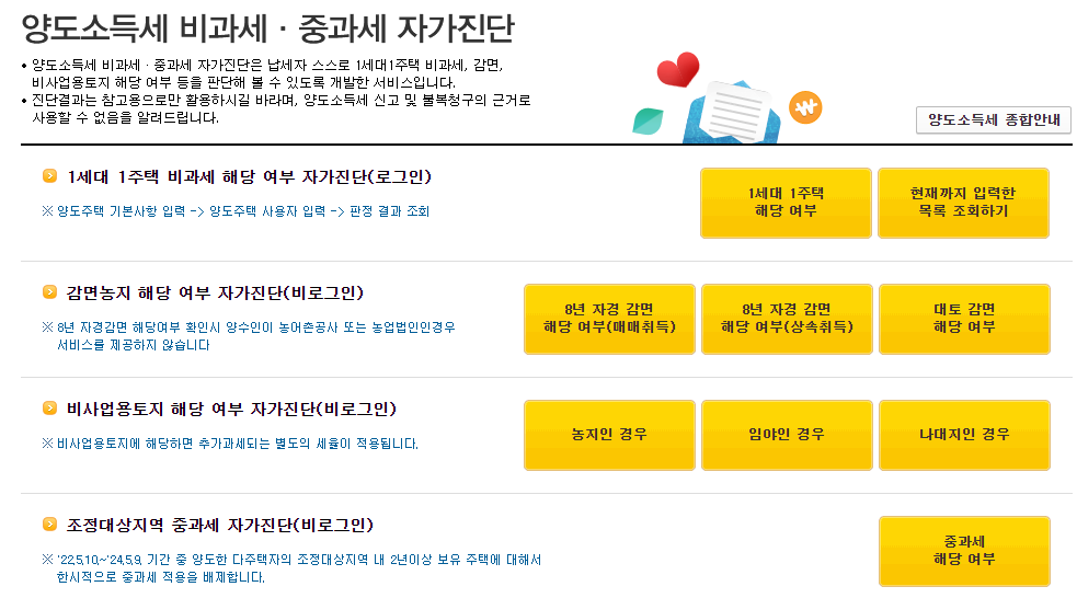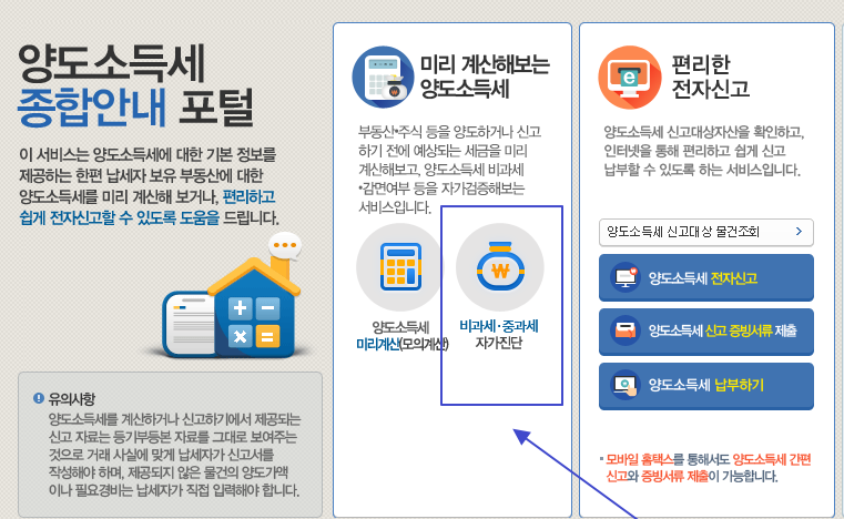 양도세 관련 세법이 수시로 변경이 되기 때문에 일일이 확인하기가 쉽지 않습니다. 이에 국세청 홈택스에서는 양도세 비과세 요건에 해당이 되는지 , 양도세 중과세 대상인지 확인할 수 있도록 양도세 자가진단 서비스를 제공하고 있습니다.