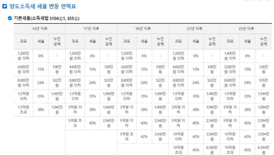 1 가구 2 주택자가 되면 다주택자로 분류되어 양도세 중과가 됩니다. 양도세율은 최소 6%~ 최대 45% 세율이 적용됩니다.