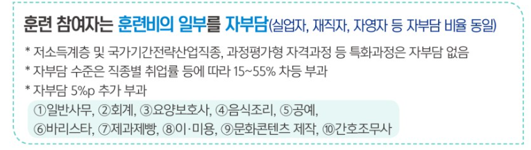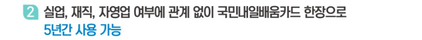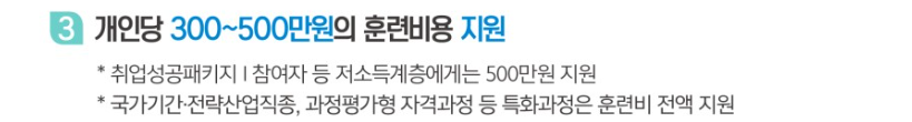 실업자, 재직자, 자영업 여부에 관계없이 내일배움카드 한 장으로 5년간 사용이 가능하고 개인당 300~500만 원의 훈련비용을 지원받을 수 있습니다.
