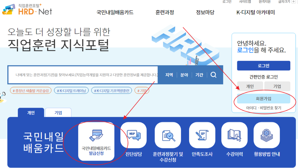 HRD Net 홈페이지에서 회원가입 후에 내일배움카드를 발급할 수 있는데 제일 먼저 회원가입을 한 후 로그인을 합니다.
