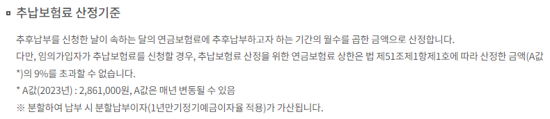 국민연금 추납제도 납입금액은 본인이 선택할 수 있지만 최소금액이 정해져 있습니다. 임의가집자의 경우 추납제도 납입금액 월 최소금액은 9만 원입니다.