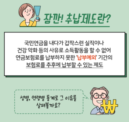 국민연금 추납제도는 국민연금을 내다가 갑작스러운 실직이나 건강 악화 등의 사유로 소득활동을 할 수 없어 국민연금을 납부하지 못한 납부예외 기간의 국민연금을 추후에 납부할 수 있는 제도입니다.