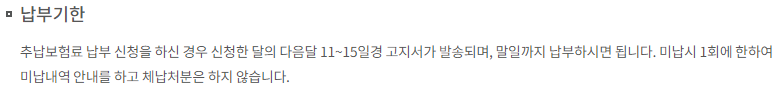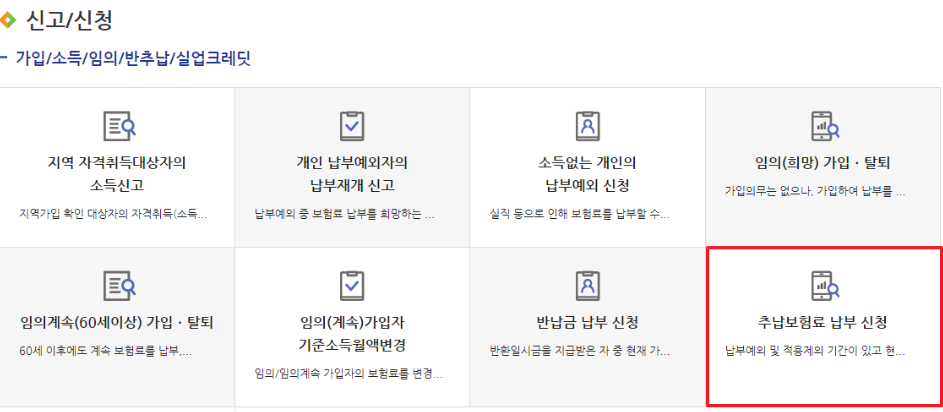 즉, 국민연금 가입 중 소득이 중단되어 국민연금을 내지 못한 납부예외기간, 국민연금을 1개월이라도 납부한 이후에 소득이 없어져 국민연금 가입 대상에서 제외된 적용제외기간이 있어야만 추납제도 신청이 가능합니다.