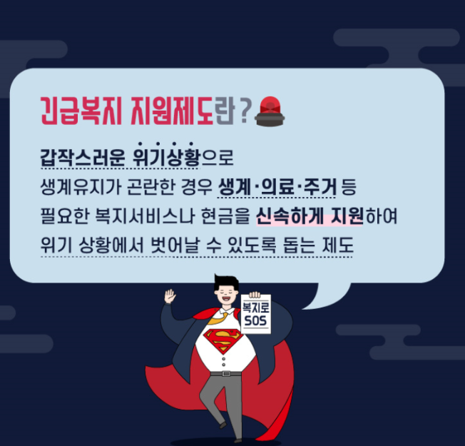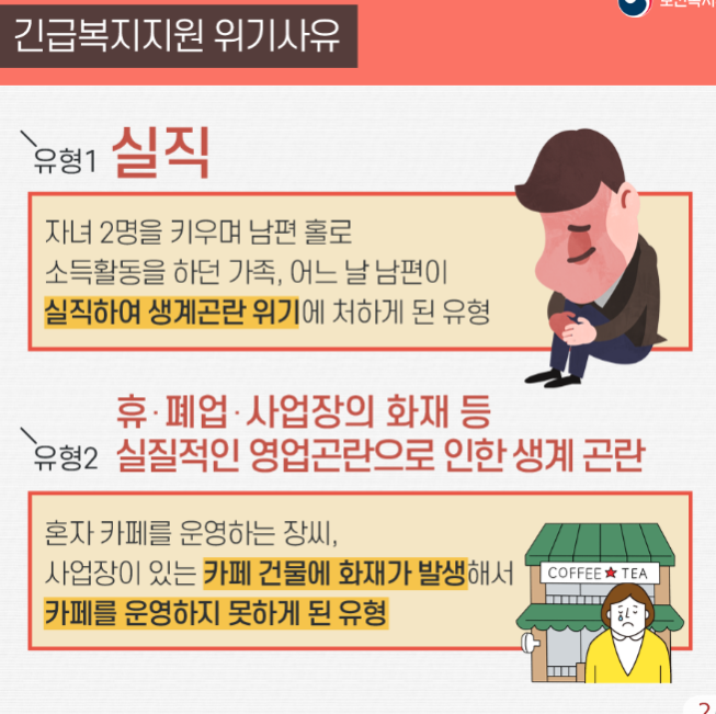 실직, 휴업 폐업 등으로 생계가 어렵게 된 가구에 신속하게 생계, 의료, 주거, 지원 등 필요한 복지서비스를 신속하게 지원하는 제도입니다.