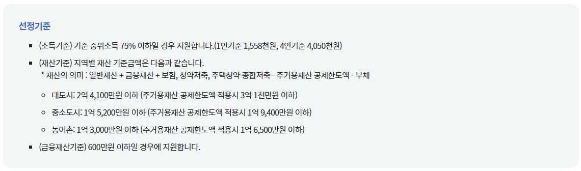 위의 경우에 해당이 되면서 , 소득과 재산의 기준도 부합하여야 합니다. 소득과 재산 내용은 아래와 같습니다.