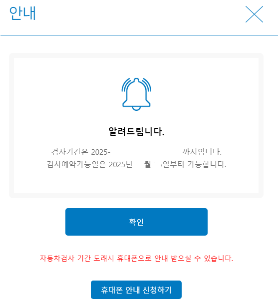 더불어 자동차검사기간이 도래했을 때 알림을 받고 싶다면 휴대폰 안내 신청하기를 클릭하면 자동차검사기간이 도래했을 때 알림을 받을 수 있습니다.