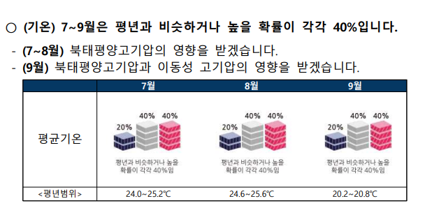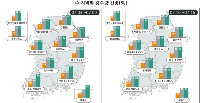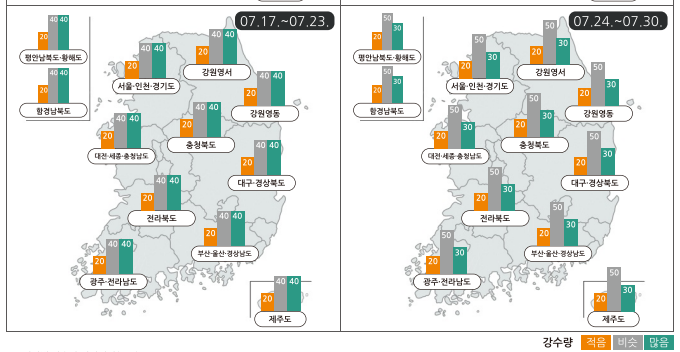 올해의 기상청에서는 월 강수량 전망을 6월과 8월은 평년과 비슷할 확률이 50%, 7월은 평년과 비슷하거나 많을 확률이 각각 40%로 예측되었다고 발표하였습니다.