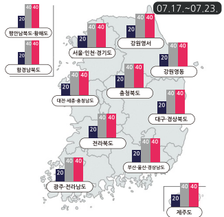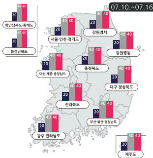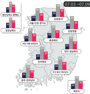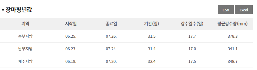지역별 장마 예상기간을 살펴보자면 먼저 중부지방의 장마 예상기간은 6월 25일경쯤부터 7월 26일까지 장마 기간이 31.5일 정도, 강수일수 17.7일이 예상되며, 남부 지방의 경우는 2~3일 정도 차이가 있습니다.