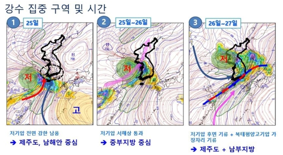 25일에는 제주와 남해안에 26일에는 중부지방에 많은 비가 내리며 본격적인 장마가 시작된다고 합니다. 27일 이후에도 덥고 습한 공기가 몰려오면서 비가 자주 내릴 가능성이 높다고 전했습니다. 특히 29~30일에는 기압골의 지나면서 전국에 비가 올 가능성이 높습니다.