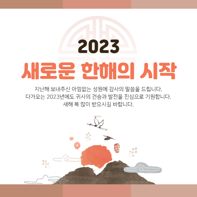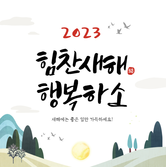 - 2023 계묘년 새해가 밝았습니다. 보내주신 관심과 사랑 덕분에 저희가 이만큼 성장할 수 있었습니다. 새해에는 여러분이 바라는 일, 소망하는 일 모두 이뤄지는 웃음 가득한 한 해 되시길 기원합니다.