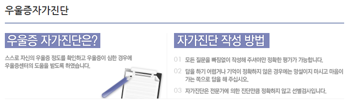 위의 우울증 자가진단 홈페이지는 우울증 센터에서 제공하는 자가진단 테스트가 때문에 다른 곳보다도 정확도가 높습니다. 질문을 통해 자신의 우울증 정도를 파악해 보시기 바랍니다.