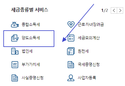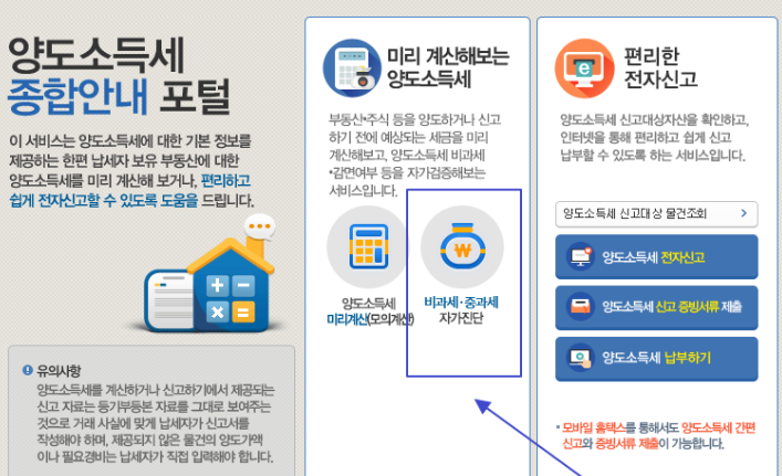 홈택스 홈페이지 메인 화면에서 ' 세금모의계산' 메뉴에서 '양도소득세'를 선택하면 양도세 자동계산을 할 수 있는 계산기와 양도세 비과세 요건에 해당하는지 자가진단을 할 수 있는 화면으로 이동하니 이용해 보시기 바랍니다.