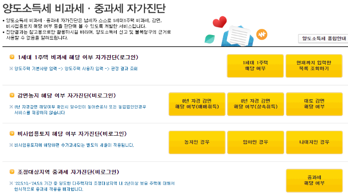 1 가구 2 주택 양도세 비과세 요건에 해당 여부를 알 수 있는 자가진단 방법이 있습니다. 바로 국세청 홈택스에서 제공하는 양도세 비과세, 중과세 자가진단 서비스입니다.