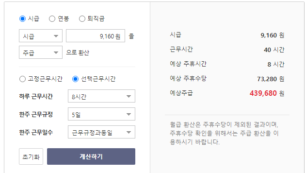 주휴수당 계산기에서 선택근무시간으로 계산하면 주휴수당 계산을 할 수 있습니다.
