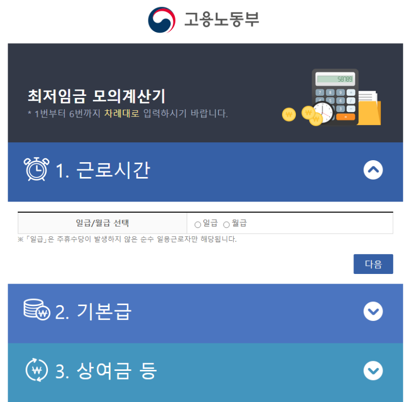 개인마다 시급이 다르고 최저임금 및 주휴수당 등을 계산하는 것이 복잡하기 때문에 고용노동부 최저임금 계산기를 이용하시면 정확하게 계산해 볼 수 있습니다.