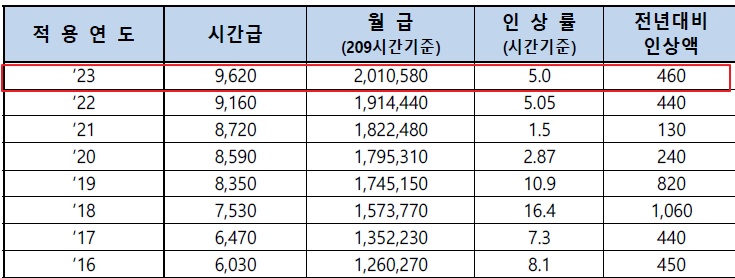 2023년 최저임금에 대해 알아보도록 하겠습니다. 최저임금은 2022년부터 꾸준히 상승했고 2023년은 5%가 올랐습니다.