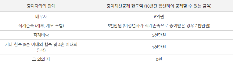 증여세 면제 한도액으로는 배우자의 경우 6억, 아버지, 어머니, 조부모 등 직계존속, 직계비속과 자녀의 경우 5천만 원 (미성년자인 경우 2천만 원)까지 증여세 면제 한도액입니다. 형제, 며느리, 고모등 그 외 친족의 경우 증여세 면제 한도액은 1천만 원입니다.