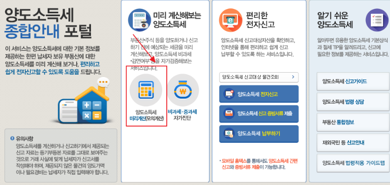 양도세를 계산하기 위해서 복잡한 양도세 관련 용어와 양도세율 등을 알아야 합니다. 이에 국세청 홈택스에는 양도세를 쉽게 계산할 수 있도록 양도세 자동계산 계산기를 제공하고 있습니다.