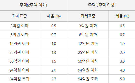 세율의 경우는 주택 수에 따라서 차이가 있습니다. 1 가구 2 주택, 3 주택 등 이상일 경우 과세표준에 따라서 세율이 다르게 적용되기 때문에 개인의 상황에 맞는 보유세 세율을 확인하셔야 합니다.