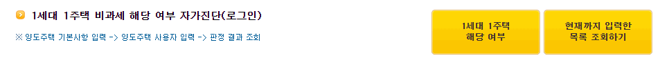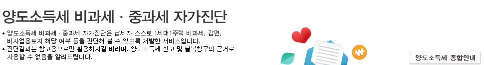 국세청 홈택스에서는 양도소득세 1가구2주택 양도소득세 비과세 요건에 해당하는지 스스로 자가진단 할 수 있도록 비과세 중과세 자가진단을 제공하고 있습니다. 이를 통해서 1가구2주택 양도소득세 비과세 여부를 확인할 수 있습니다.